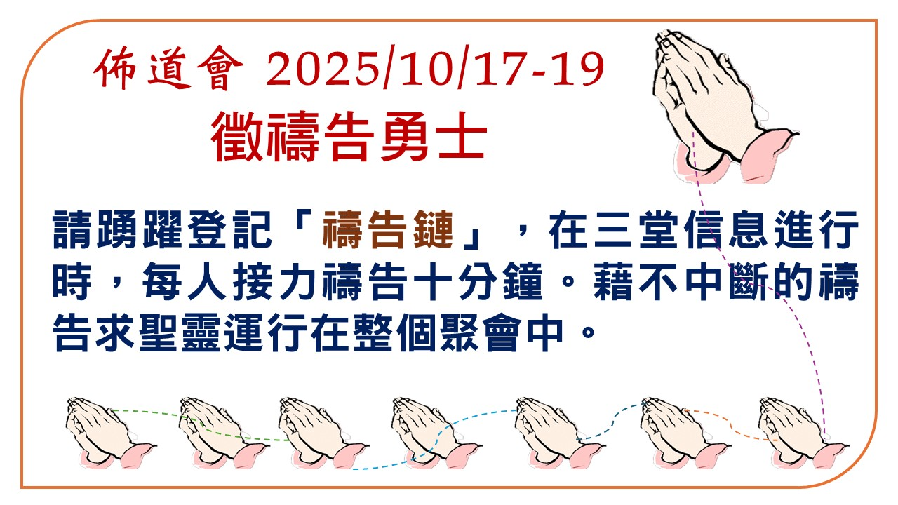 鼓勵弟兄姊妹一同參加禱告會,為教會,肢體,宣教士同心合意地禱告。